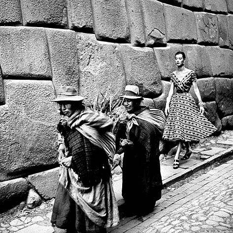 Opening photograph for the Exhibition “Weavers of the Cloud” Photograph by Toni Frissel for Harper’s Bazaar, 1952.The stone wall in the background heightens the notion of timelessness and the overall contrast between Western and non-Western civilisations — linking Peru to a pre-civilized society where traditional methods of production play a secondary aesthetic role in an era of globalised production. In similar fashion, the exhibition catalogue cover (fig. 1) depicts women weavers and children wearing primarily traditional costumes in an Andean region. While this image may well depict rural life in the Andes, it endorses a racialised paradigm of Peruvian society as underdeveloped, fixed in earlier times and far-removed from modernity and by extension, rendering Indigenous weavers as the Other.was presented at the Fashion and Textile Museum in London from June to September 2019. Curated by British artist and curator Hilary Simon, the exhibition was the first of its kind in the UK and it included 150 textiles, garments, accessories, art pieces and photographs organised in eleven sections. With Peruvian materials, styles, and articles of dress constituting an on-going source of inspiration for Western fashion, this exhibition presented itself as an opportunity to examine the history, present and future of Peruvian artistic savoir-faire, and to use the language of fashion to challenge traditional divisions of form and function, cast a critical eye on the construction of tradition and reinterpret cultural knowledge. Surprisingly, however, the curator opted for a narrative that emphasised non-Western dichotomies of Peruvian culture as the essence of the country.