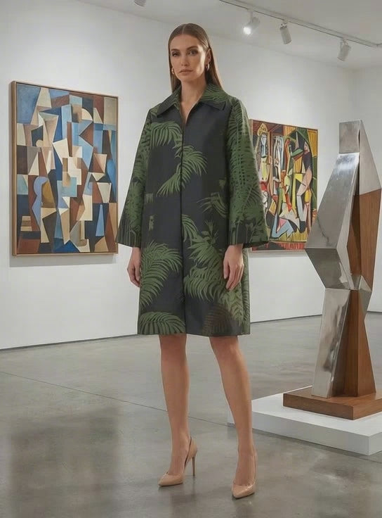 Step into understated sophistication with our oversized light coat, showcasing reimagined Broadhurst prints in nostalgic tropical hues. The universally flattering fit accommodates all body types, while two generous pockets add practical functionality.